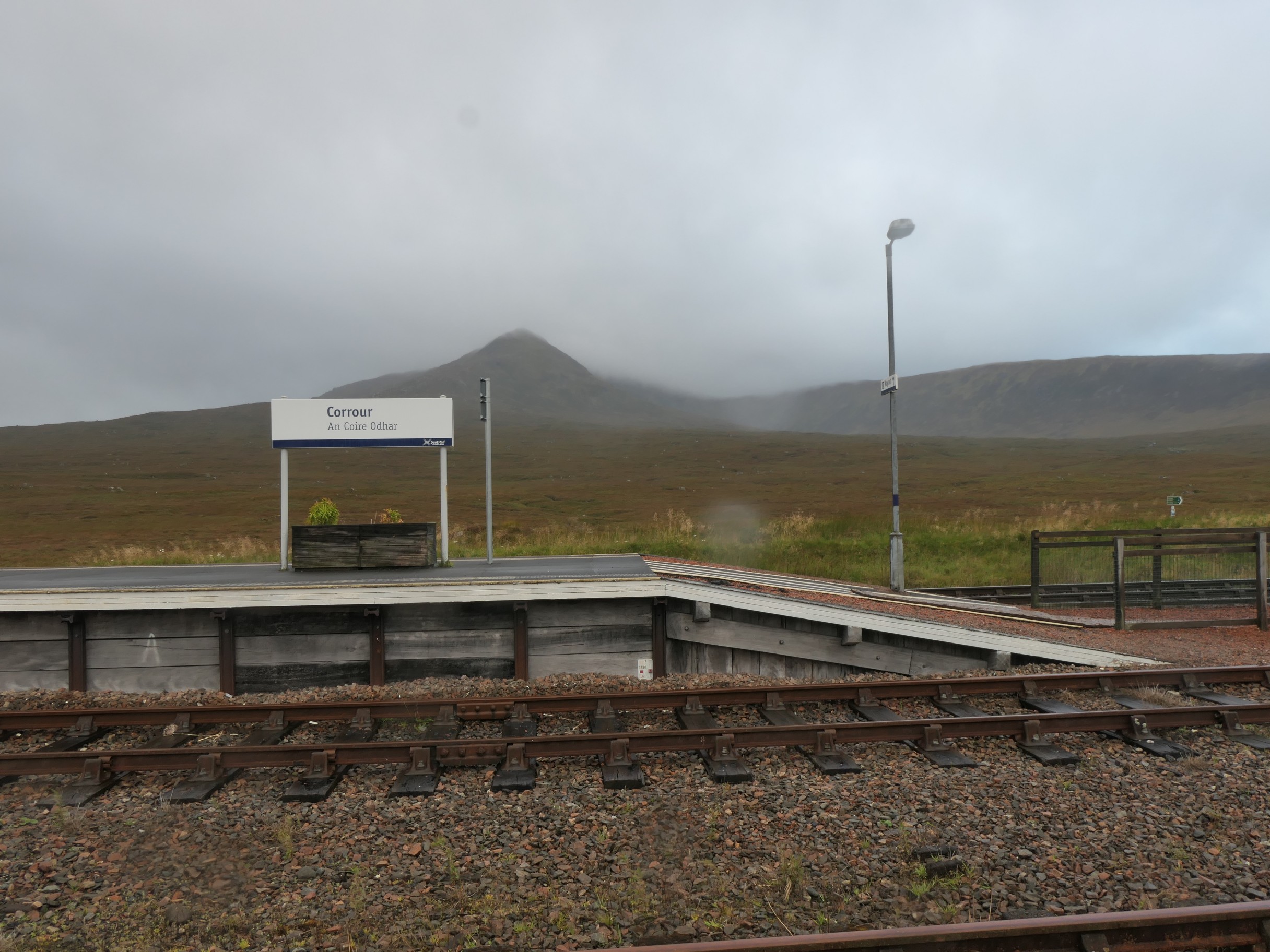 Train pour Corrour, une gare paumée au milieu de rien. Un endroit parfait pour le début d'un bon polar ou forcément le corps d'une femme est retrouvé dans les tourbières au dessus desquelles planent des brumes aussi humides que mystérieuses, voire austères. Corrour, juste un quai, même pas une salle d'attente dans laquelle passer la nuit. Une taverne ou les locaux, roux de préférence, viennent boire leurs pintes en fin de journée, en pick up 4 x 4. Pas de route ici, juste des pistes au milieu des tourbières. J'ai dû installer ma tente sous la flotte et dans le vent mais comme je monte l'extérieur en premier, l'intérieur reste sec et ça n'a pas de prix. Test de tenue au vent encore, et d'imperméabilité. J'ai dormi comme un loir et profité au matin d'une accalmie pour tout replier et partir. De Corrour j'ai rejoint Dalwhinnie en un jour et demi à pied, ai eu du beau temps et du vent fort dans le dos, ai beaucoup apprécié ce tronçon très sauvage où la sente a fini par se perdre dans la tourbe, n'ai croisé personne, et ai fait un bivouac magnifique dans un silence total. C'est assez rare pour être noté. À Dalwhinnie, j'ai loupé le train à 30 secondes, vraiment, malgré une course effrénée avec mes 15 kilos sur le dos, il est reparti alors que j'arrivais à la gare à bout de souffle. Alors j'ai tendu le pouce jusqu'à Blair