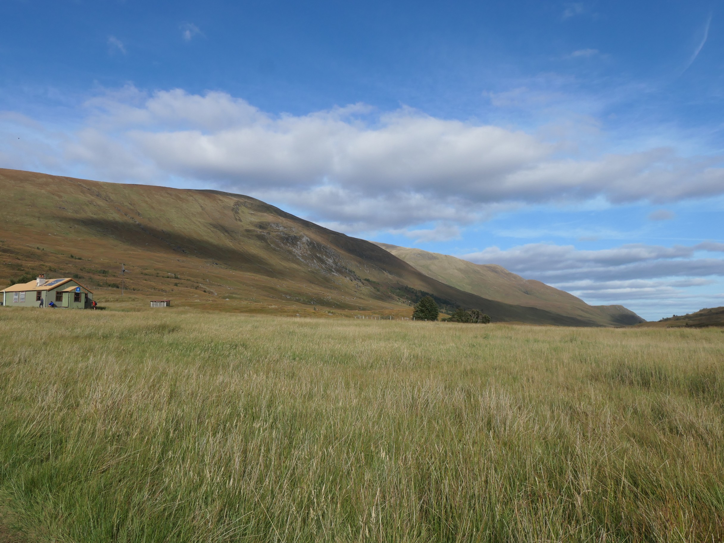 m d'altitude, c'est la haute montagne. Il fait froid, le vent peut être violent, le brouillard à couper au couteau, bref, l'environnement hostile. La météo y est totalement incertaine, imprévisible. Mon bothy est minuscule, deux couchettes, quelques chaises, un banc scellé au mur. Je ne le sais pas encore mais nous serons 8 à dormir dans ce minuscule espace, et 4 dehors. Il fait froid, 13 degrés, mais la température montera avec l'arrivée des autres marcheurs. Dehors cela fait 2 heures qu'il pleut. Les sommets, culminant à 1200 m, sont tous tronqués à la même hauteur par les nuages épais et tenaces. J'ai marché 3h pour venir ici, remonter ce bout de vallée à travers la lande, la tourbière imbibée, les marais, sur un sentier boueux où il faut poser les pieds avec attention sur les points durs qui dépassent afin que les souliers ne se fassent pas engloutir par les mousses, les sphaignes, les trous d'eau ou la tourbe noire, dans une vallée très large ou une rivière assez paresseuse serpente. Ce paysage me rappelle tour à tour l'Alaska ou la Laponie Suédoise sans la neige. Les sommets alentours sont de gros monticules, pas vraiment escarpés, mais pas doux non plus, entre les deux, ni de la rando, ni de l'escalade, et pas même de la varappe. Personne.