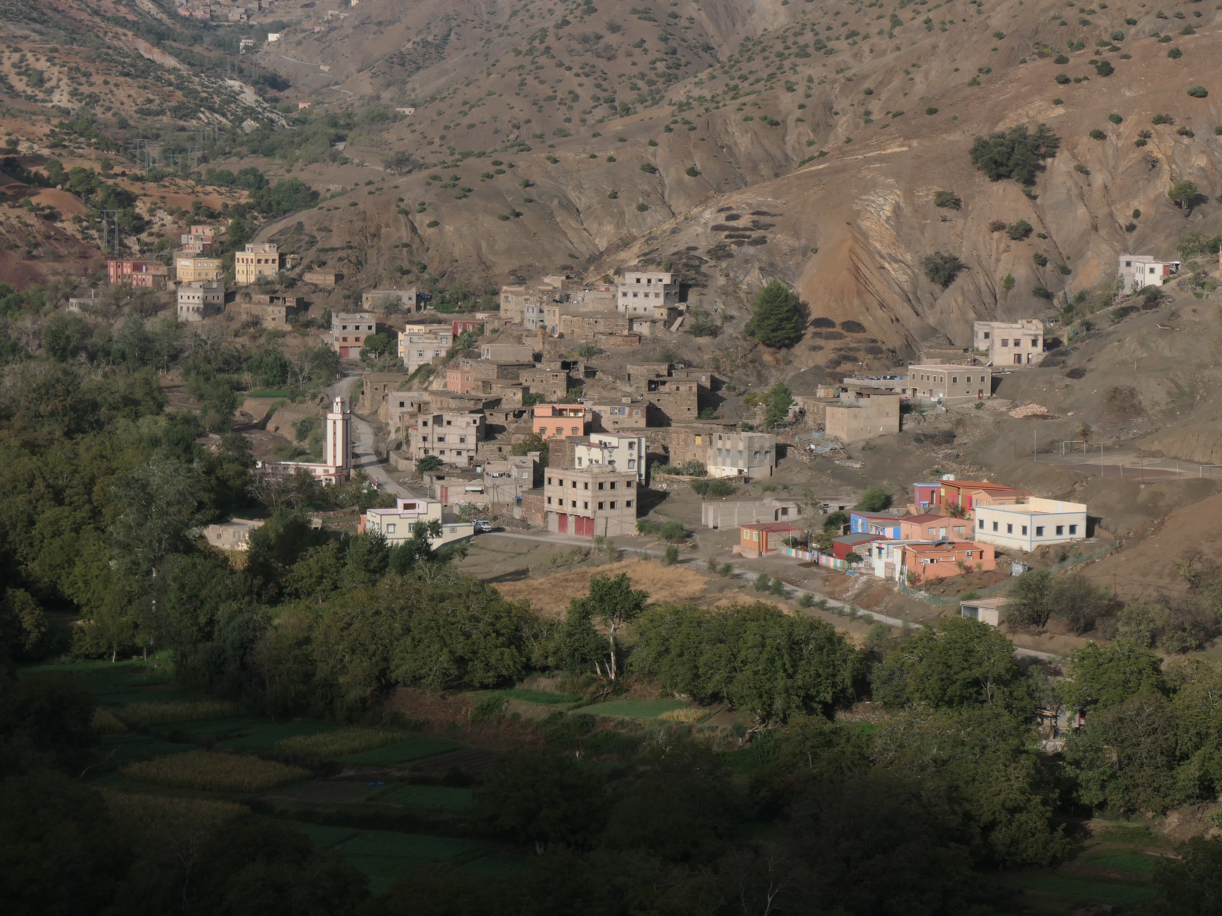 bâtiments massifs en pierres, bois et pisé. Philippe a les intestins en vrac, je soupçonne une giardiase, et dans l’après-midi, dans ce gîte chez l’habitant au bout d’une piste accrochée comme elle peut à la montagne, cul de sac, la boîte de médocs arrive sur la table. La logistique marocaine, la chaîne humaine s’est mise en branle, avec une efficacité incroyable. Les médocs sont arrivés de Demnate (80 km) dans une bagnole, dont le chauffeur a laissé la boîte à un type qui venait jusqu’au village à pied avec son âne chargé, 6 km. Voilà, c’est ça aussi le Maroc. Le total du transport a coûté 2,4 euros !!!