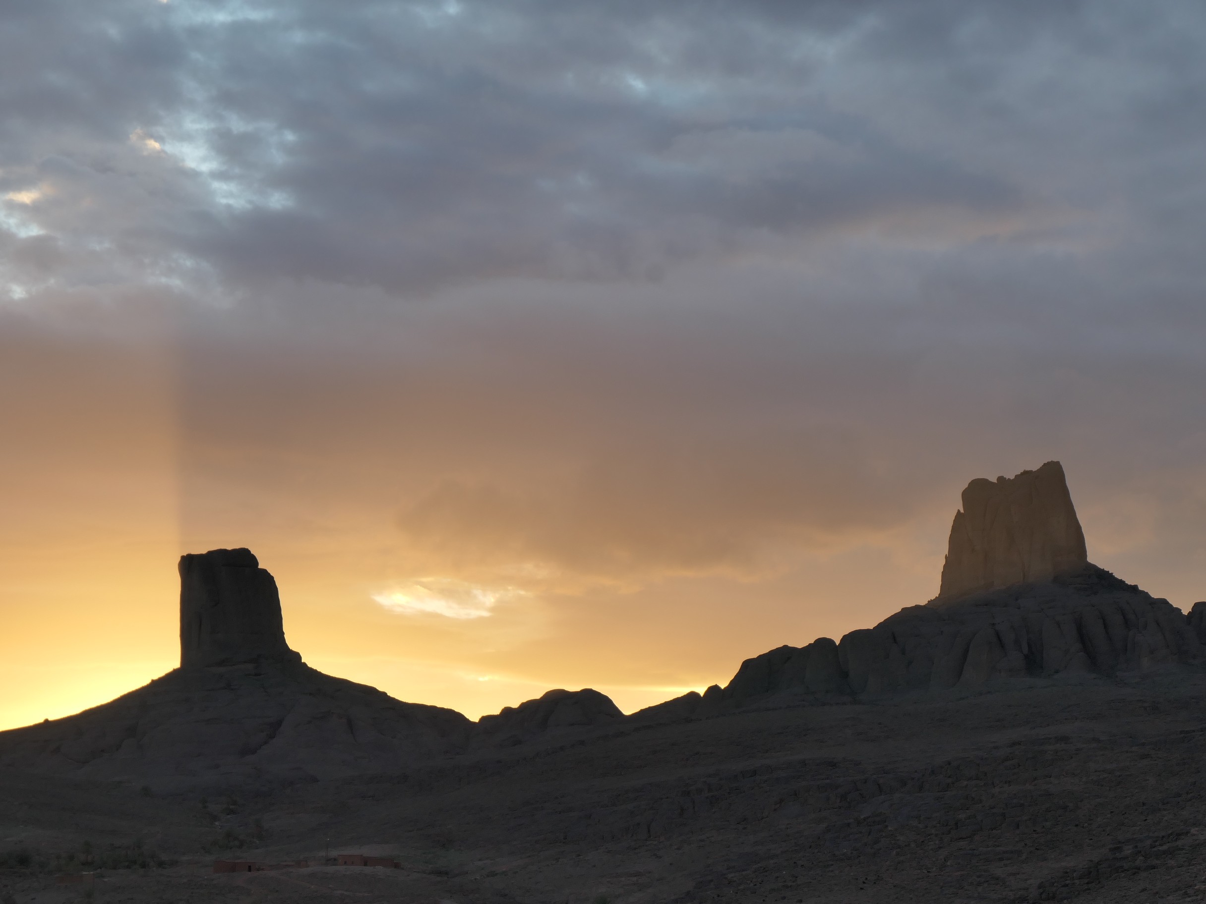 De la piste, de la piste encore pour le démarrage ce 11 octobre qui marque les 4 semaines depuis notre débarquement à Nador. Paysages différents, plateau désertique, puis constellé de villages dans une belle vallée cultivée avant de descendre complètement la somptueuse vallée des Roses. À l’heure de la prière, les chants des différents muezzins de la vallée se mêlent et résonnent entre les montagnes abruptes. Nous posons ce soir là nos