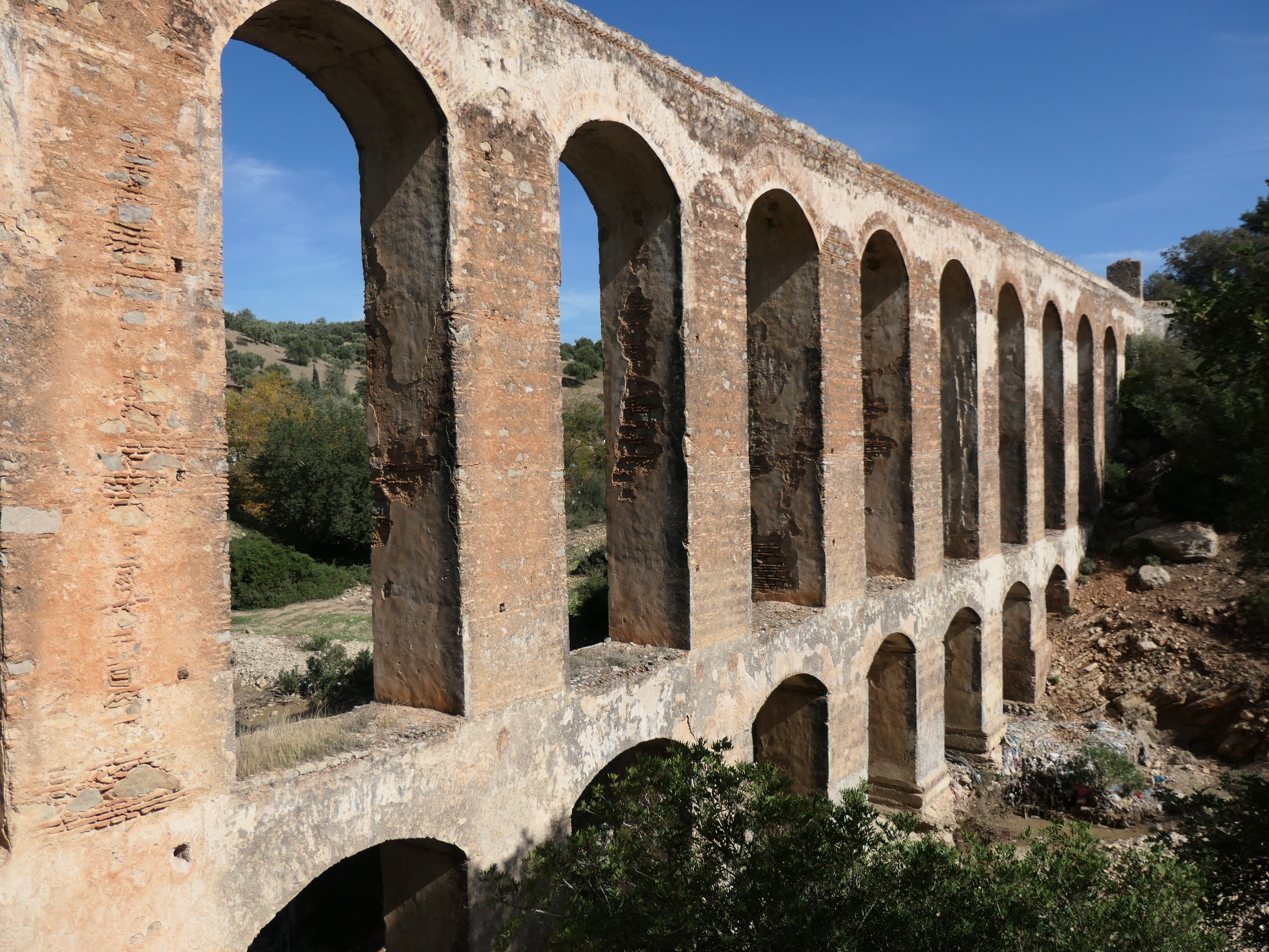 Moulay Idriss, pour y voir un vieil aqueduc et plus loin, un site romain ma foi assez important : Volubilis, construit sur une ancienne capitale… mauritanienne. Mosaïques, colonnes torsadées, arc de triomphe, chapiteaux travaillés de colonnes, ancienne basilique. Plus tard, les pierres du site ont été utilisées pour construire Meknes. Aucune explication sur place, c'est dommage ! Le site est vaste, au milieu de terres cultivées, beaucoup d’oliviers entre autres. En cette saison, la terre est labourée mais on n’y voit rien de plus. Le paysage est donc terne, morne et monotone, assez vallonné pour mettre les jambes en vrac. De temps en temps, j'aperçois au loin ce qu'il reste d'eau dans les retenues des nombreux barrages. Cela fait longtemps qu’il n’a pas plu, l’atmosphère est poussiéreuse, pas de lumière. Le lendemain fut du même acabit, je reste à basse altitude. Je trouve un joli coin pour bivouaquer,