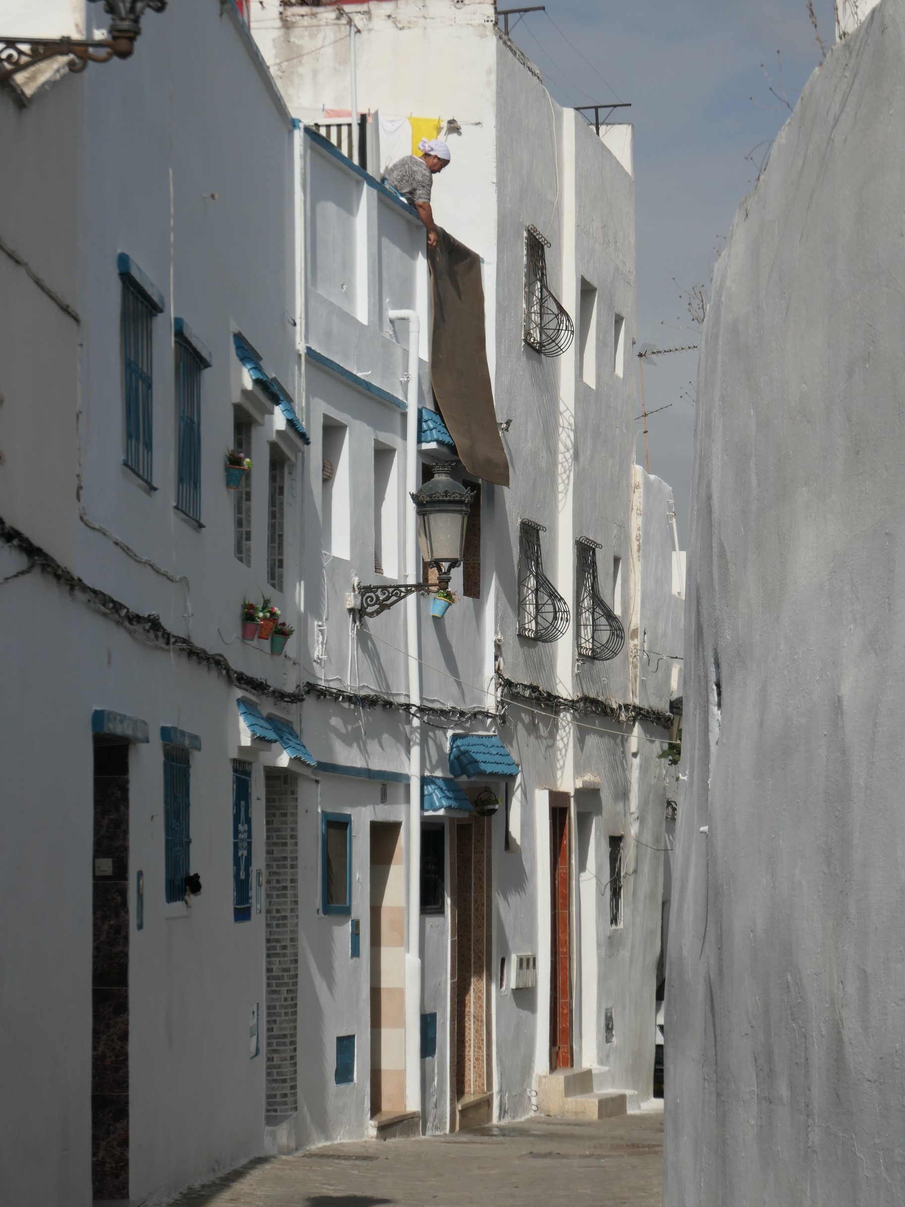 Les portes qui permettent l’accès à la médina n’ont rien d’exceptionnel et celle-ci est beaucoup moins vaste qu’à Fès ou Chefchaouen. En me promenant le matin comme ça, je me rends bien compte qu’il y a beaucoup de SDF qui dorment dans des recoins, et qui mendient en journée, qui passent vite vite dès que les clients se lèvent de leur chaise de resto pour attraper les restes dans l'assiette avant que le serveur ne débarrasse. Trop de pauvres gens, hommes ou femmes, qui passent la journée à arpenter les rues et haranguer le chaland pour tenter de lui vendre un paquet de mouchoirs en papier, une clope, un paquet de bonbons, une petite bouteille d’eau… Tétouan est une grande ville, et toujours dans la “vieille ville” il y a le quartier d'architecture coloniale espagnole, avec des murs blancs, des balcons travaillés. Partout ici, on s’adresse à moi dans la langue de Cervantès et la majorité des visiteurs viennent de la péninsule ibérique.