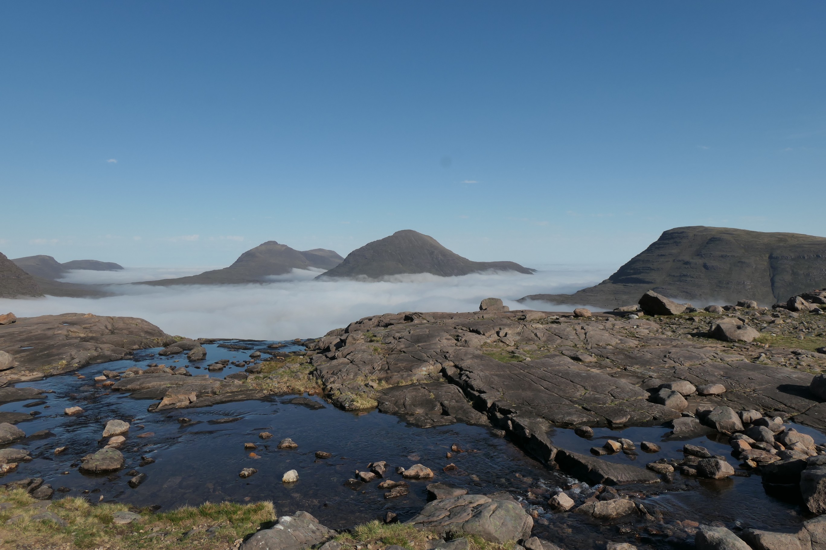 Le matin du jour suivant pariant de manière un peu osée sur la météo du jour, je prends le bus pour Morvich et reprends le Cape Wrath trail (CWT) en gros là où j’avais dû abandonner l’an dernier. Et cette fois-ci je me régale, mets des variantes montagneuses sur mon itinéraire, des lignes de crête parfois bien assez techniques avec un peu de gaz, augmentant par la même occasion et de manière considérable le nombre de munroes à mon actif ( sommets de plus de 3000 pieds). La météo est belle dans l’ensemble. Les jours sont si longs, de 4 à 23 heures, que j’attends parfois la fin d’une perturbation avant de partir pour mon étape, à 16 heures, ou au contraire de terminer ma journée à 10 heures après déjà 5 heures de marche. Je m’adapte et ne sors jamais la cape de pluie, profite des créneaux soleil pour parcourir les parties en altitude. 25, 30, 35 km par jour, sur du terrain allant du macadam au mode sanglier, sans sente. En effet le CWT est une espèce de GR mais sans balisage et parfois sans sente, pas de pont pour enjamber torrents et rivières, les déchaussages sont fréquents. Sur les longues parties asphaltées, je tends le pouce. Une fois, c'est le