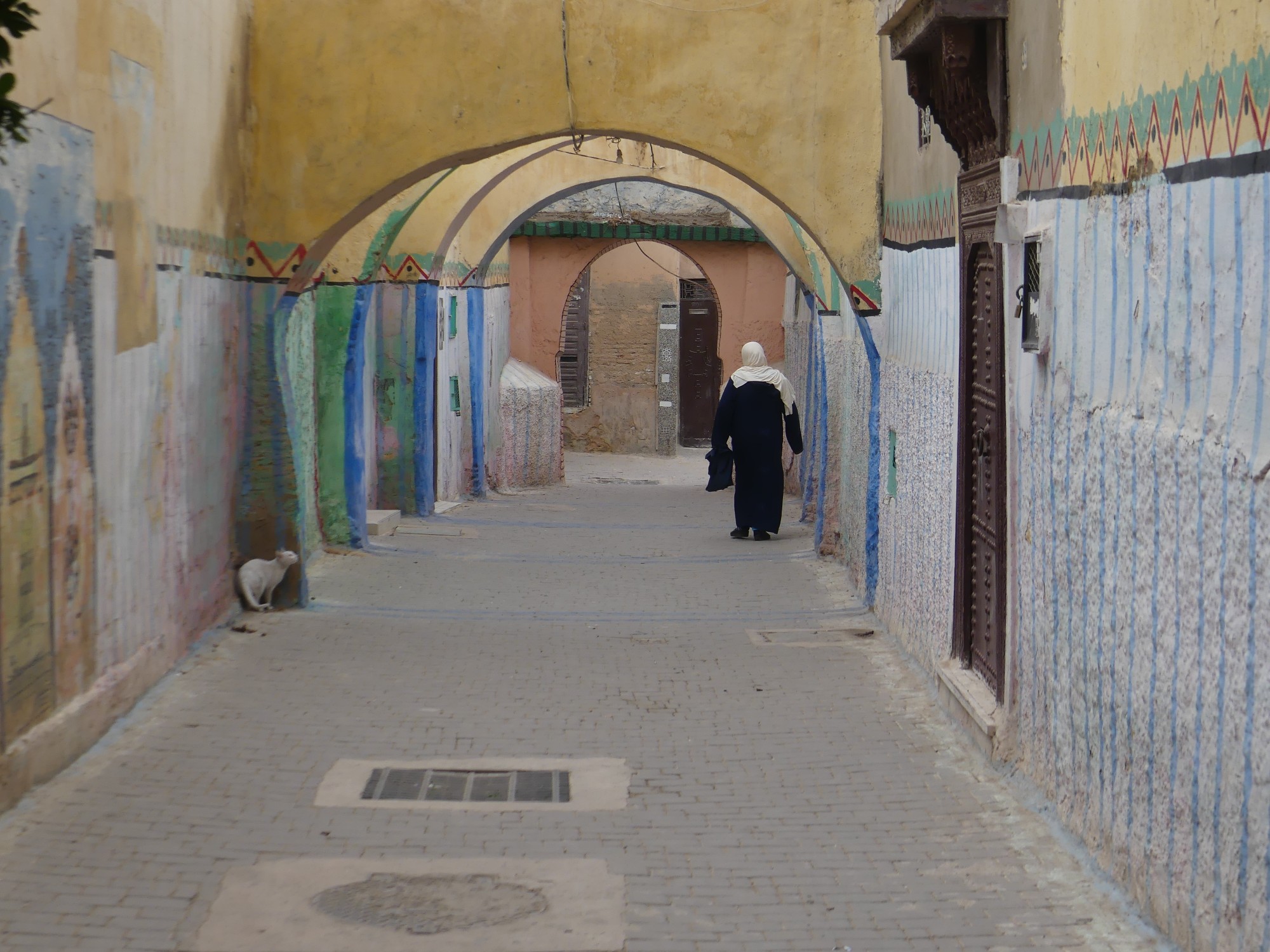 étroites et trop hautes. Au moins, pas de contraste compliqué à gérer avec tout noir d’un côté et cramé de l’autre. J'aime bien cette médina, elle est calme, habitée, pas trop commerçante, propre. Mes pas me mènent ensuite vers d’autres intérêts comme le bassin Agdal, réserve d’eau ancestrale, accolé aux écuries et greniers antiques fermés actuellement, le palais royal dont on ne voit que la porte mais dont on devine l’étendue puisque le tour de l’enceinte fait 3,5 km. En fait, à l’intérieur, se trouvent l’ancien palais en ruines de Moulay Ismaïl, le palais de Momo 6, et le golf royal. On voit tout bien en vue satellite sur gogole map. Si je suis passée voir le mausolée de Moulay Ismail, c’est uniquement pour voir les mosaïques, les boiseries et la pierre sculptées, l’art floral, la géométrie et la calligraphie qui sont les 3 piliers de l’art arabe. J'ai terminé par la cité médiévale, déroutante, un autre monde d’arches, de murs très hauts, de voûtes, de vieilles pierres sur des murs rénovés. Beaucoup d’impasses. La cité est habitée, par des familles. Ce lieu est vraiment surprenant. Ce sera le