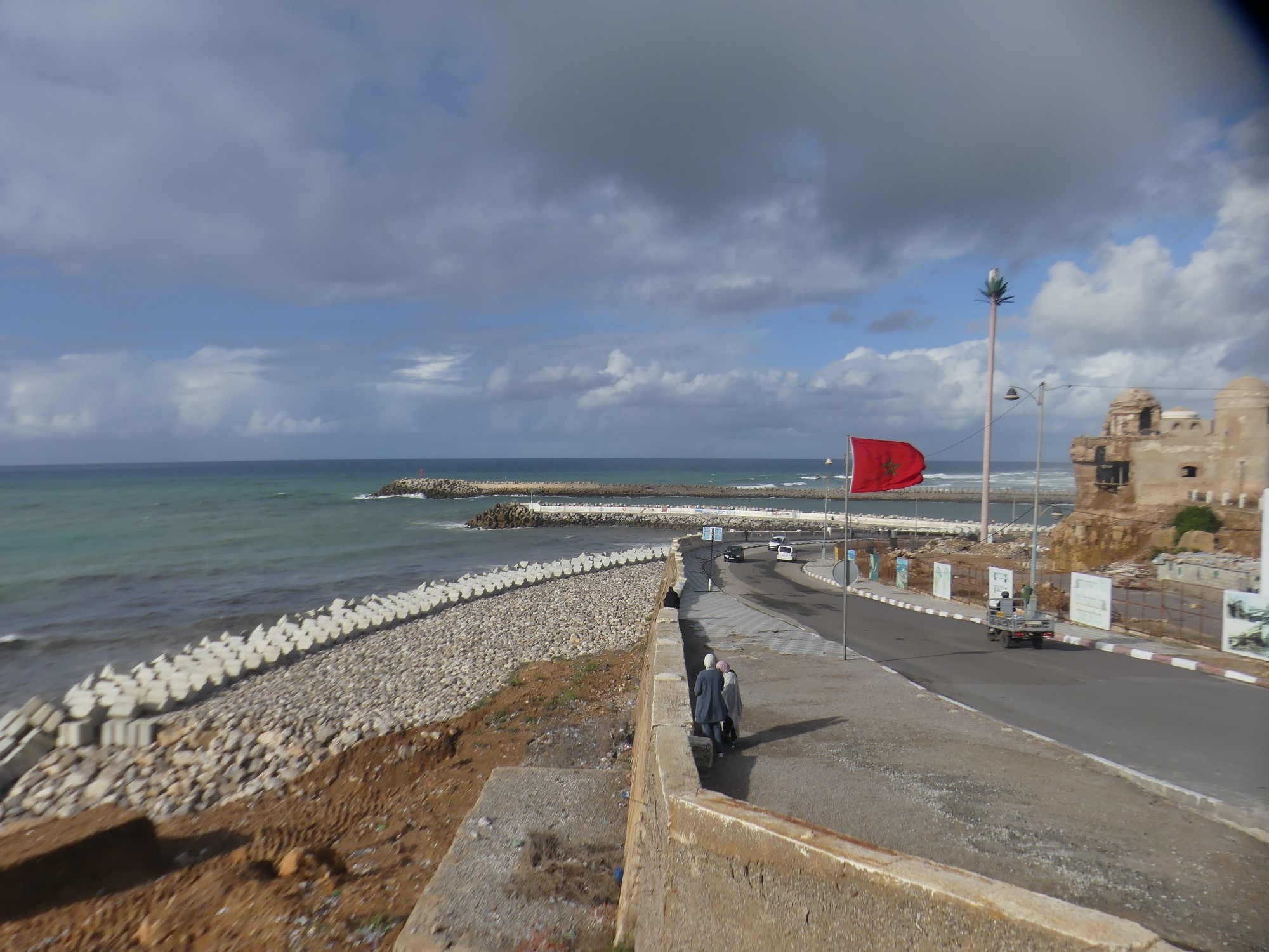 Le trajet entre Casablanca et Rabat n’offre guère d’alternatives, ce sera donc par la 2x2 voire 2x3 voies. C’est lisse, et comme c’est dimanche matin, j’ai les 2 ou 3 voies pour moi ou presque. Pas de trafic, mais des cyclistes par dizaines, dont je prendrai parfois la roue pour m’abriter du sensible vent de face. Je fais une halte au musée de la photographie à l’entrée de la ville, n’y rentre pas car la plus grande partie des photos exposées se trouve à l’extérieur, autour d’un bastion magnifique orné de 2 canons, au bord de l’océan déchaîné. Des portraits, que des portraits, de quidams du monde entier. J’ai aimé cette halte. Puis il y eut le phare et la corniche. Les vagues s’écrasent fort et les gerbes d’écume montent très haut. Spectacle garanti, la puissance de l’eau… La côte étant brumeuse ce jour, je reviendrai. Il ne me restait qu’à suivre les remparts pour atteindre le centre. Après au moins 15 enseignes prospectées, trop chères ou pleines, je me retrouve dans un dortoir de 14, qui heureusement n'est pas plein, à l’auberge de jeunesse sommaire. 7 lits superposés entassés dans une pièce borgne, pas de cuisine, interdiction de laver du linge même si je le ferai discrètement par petites quantités, pas de petit-déjeuner, bien situé, silencieux, patio et terrasse agréables… le tout pour plus cher qu’une chambre simple dans un hôtel…