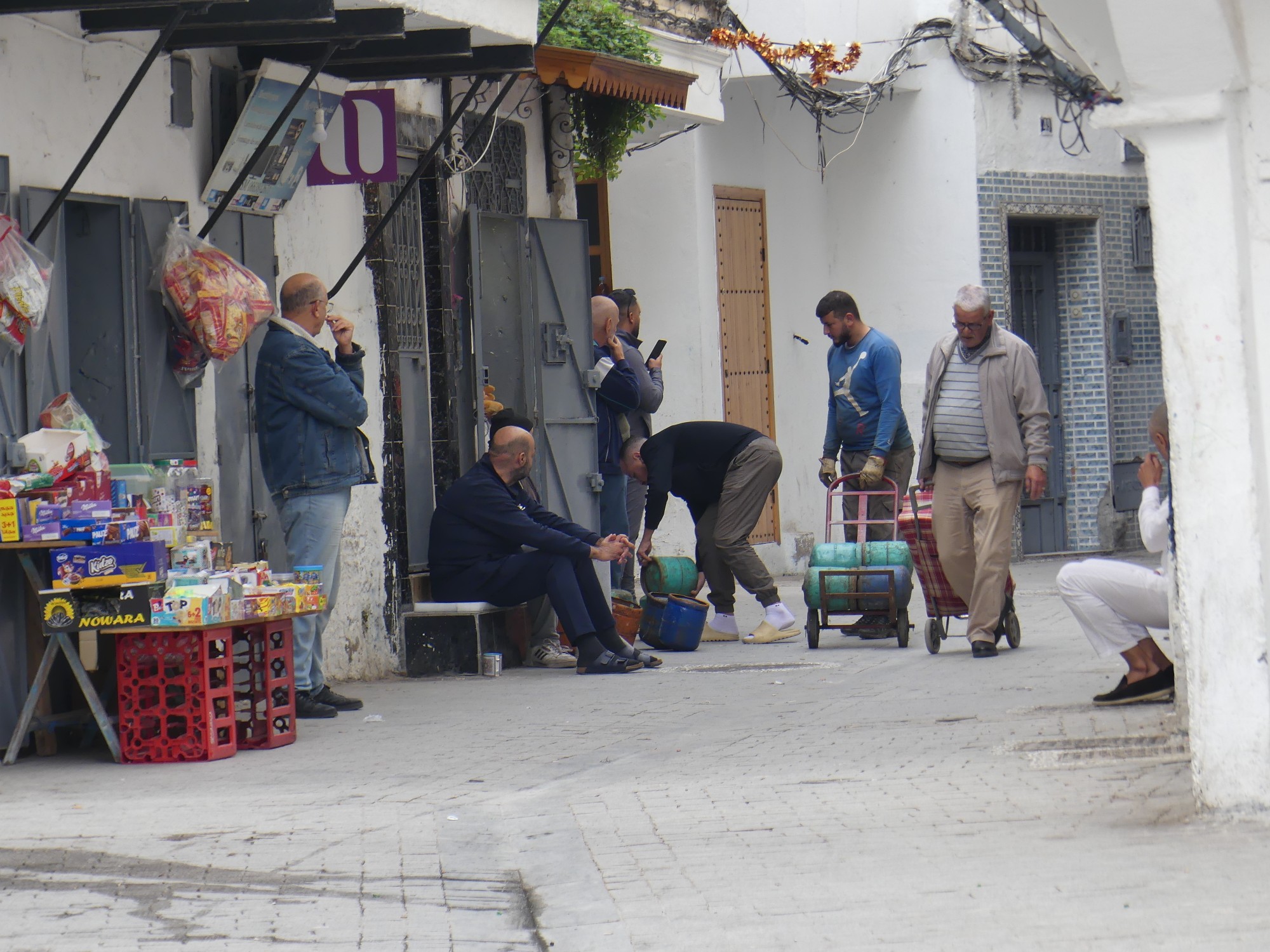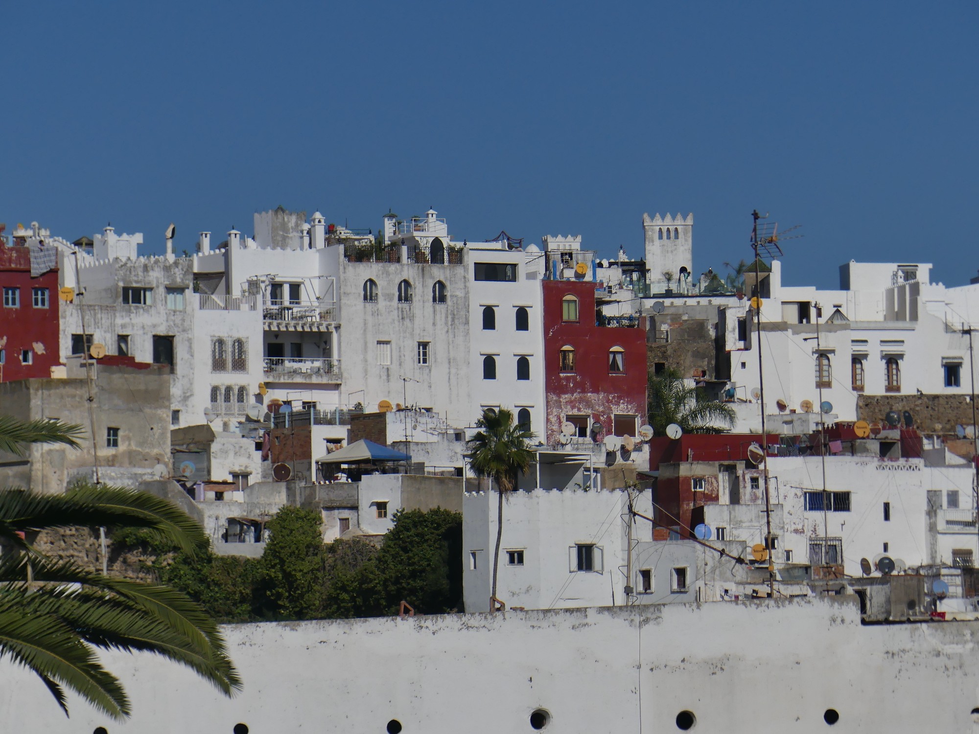Tanger, toujours cette chanson dans la tête, elle ne me quittera pas tant que je ne la quitterai pas moi-même. Il n’y a franchement pas grand chose à voir. La médina, ok, les ruelles sont trop étroites, trop hautes, trop commerçantes, aucun rayon de soleil et pas vraiment de détails croustillants à se mettre dans l’objectif, même en arpentant de bas en haut et de droite à gauche au pas de sénateur, coincée derrière des groupes de 50 en file indienne. Beaucoup d’Espagnols. D’ailleurs c’est dans cette langue que je me fais souvent alpaguer, exit le french, ça rafraîchit mes modestes connaissances. Sinon, que des commerces. Les portes n'ont rien de spectaculaires. Non, je ne suis pas blasée. Le quartier Dradeb, tout en escaliers, pas de commerces, des habitants, et visiblement pas les plus riches de la ville. Ça fait comme une autre médina sauf que le quartier n’est pas ceinturé. De loin, et au soleil toute la journée, l’étalement des murs blancs sur le flanc de la colline est plutôt photogénique. Ensuite, le port, de pêche, de plaisance ou de ferries, tout est totalement inaccessible,