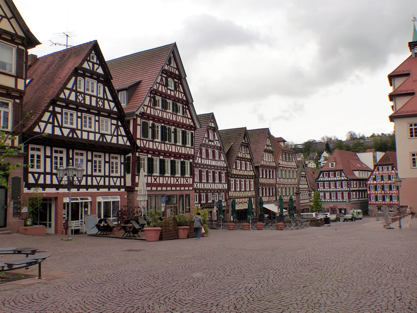 Les rues de Calw sont balayées par un vent glacial, certes la place centrale et les rues adjacentes sont particulières et très riches avec toujours ces hautes maisons à colombage. De là, le soir arrivant, je m'inquiète de me loger, contacte par téléphone un ws dans le patelin suivant et bingo, me voici chaleureusement accueillie pour la nuit à Hirsau chez Bea et sa famille. Après manger, elle m'emmène à pied visiter les ruines du monastère qui devait être énorme. C'était en fait la capitale religieuse de la vieille Allemagne,la basilique comportait deux grandes tours dont une seule reste debout. Ayant servi de prison par la suite, les habitants de Calw n'ont pu en prendre les pierres pour construire leur maison. Le cloître est très grand par rapport à ceux d'autres abbayes que j'ai pu visiter. Bref, j'ai failli pas