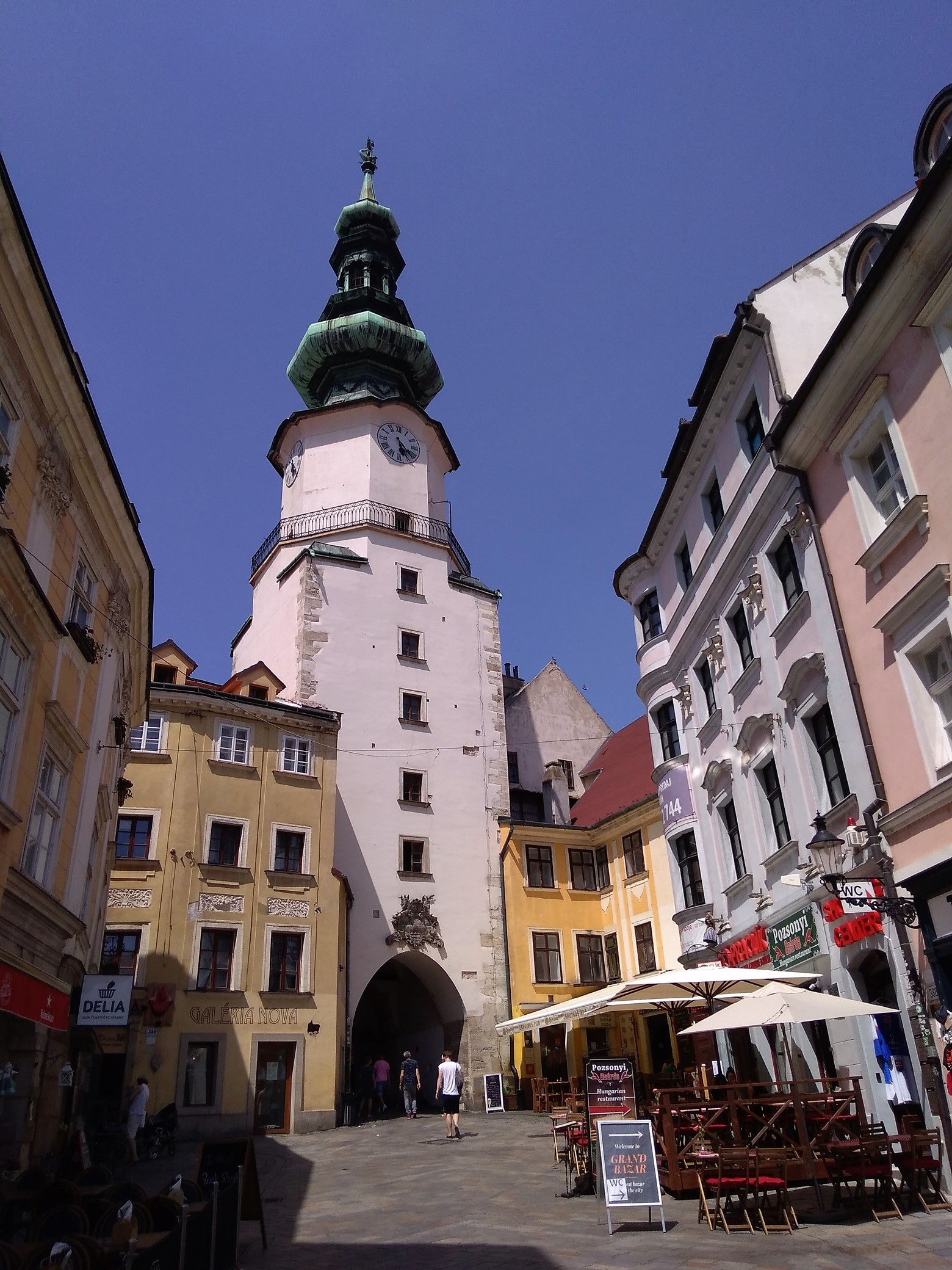 Le centre-ville de Bratislava est très vite visité. Grand comme un mouchoir de poche, j'en ai vite fait le tour. Le Danube n'est même pas bleu, mais il est large tout de même. Le petit centre historique est sympa, quelques bâtiments tout juste remarquables, une église, une porte, deux rues, deux statues et deux places, le château pour la vue sur la ville et le fleuve. Assez peu de touristes, ils sont tous à Vienne qui n'est qu'à 60 km. Le reste de la ville est comme une énorme banlieue. C'est réducteur comme vision, je sais, il y a aussi quelques musées.