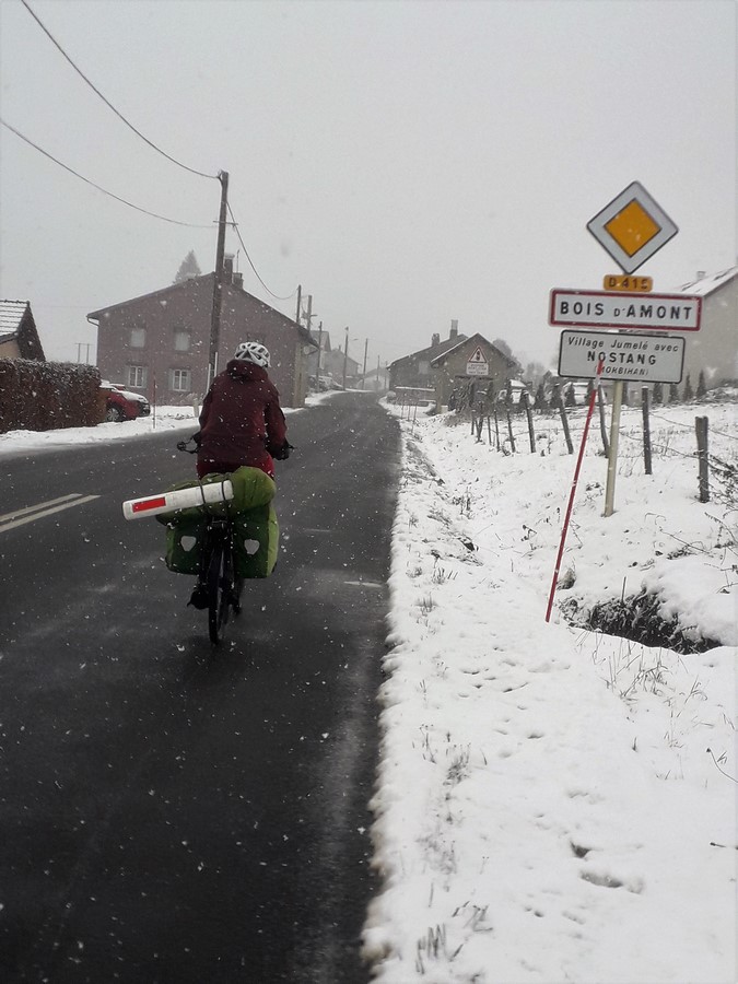 mes parents venus à ma rencontre. Les retrouvailles sont courtes, il faut que je termine au plus vite, je suis mouillée, j'enfile une paire de surchausses néoprène et attaque la dernière bonne grimpette, le dernier col, celui de la Givrine à 1235 m d'altitude, le plus facile, le plus court, le plus bas pour rentrer chez moi de l'autre côté du premier pli jurassien. Plus je monte plus il fait froid et bientôt la pluie se transforme en neige. Je ne me suis pas débarrassée de mes sacoches, je ne sais plus conduire un vélo non chargé ! Au col j'ôte la veste trempée et les gants fins, enfile des gants chauds et une bonne gore-tex sèche. La neige commence à prendre sur la route, c'est très glissant, savonnette, et je dois être très vigilante. Certains conducteurs très délicats ne s'écartent pas assez et m'envoient des gerbes de gadoue sur la jambe gauche, j'ai juste un collant... J'ai du mal à ouvrir les yeux à cause des flocons. Lunettes. La neige colle sur les verres, j'essuie régulièrement comme je peux, je connais la route par cœur mais bon... Passage de la douane à la Cure, j'irai au bout. Étant à peine redescendue, là où les roues des voitures passent il n'y a pas de neige, je fonce. Les Landes, le Noirmont, La Bourbe, le Gravier, voici le panneau d'entrée du village, le dernier de ce voyage !