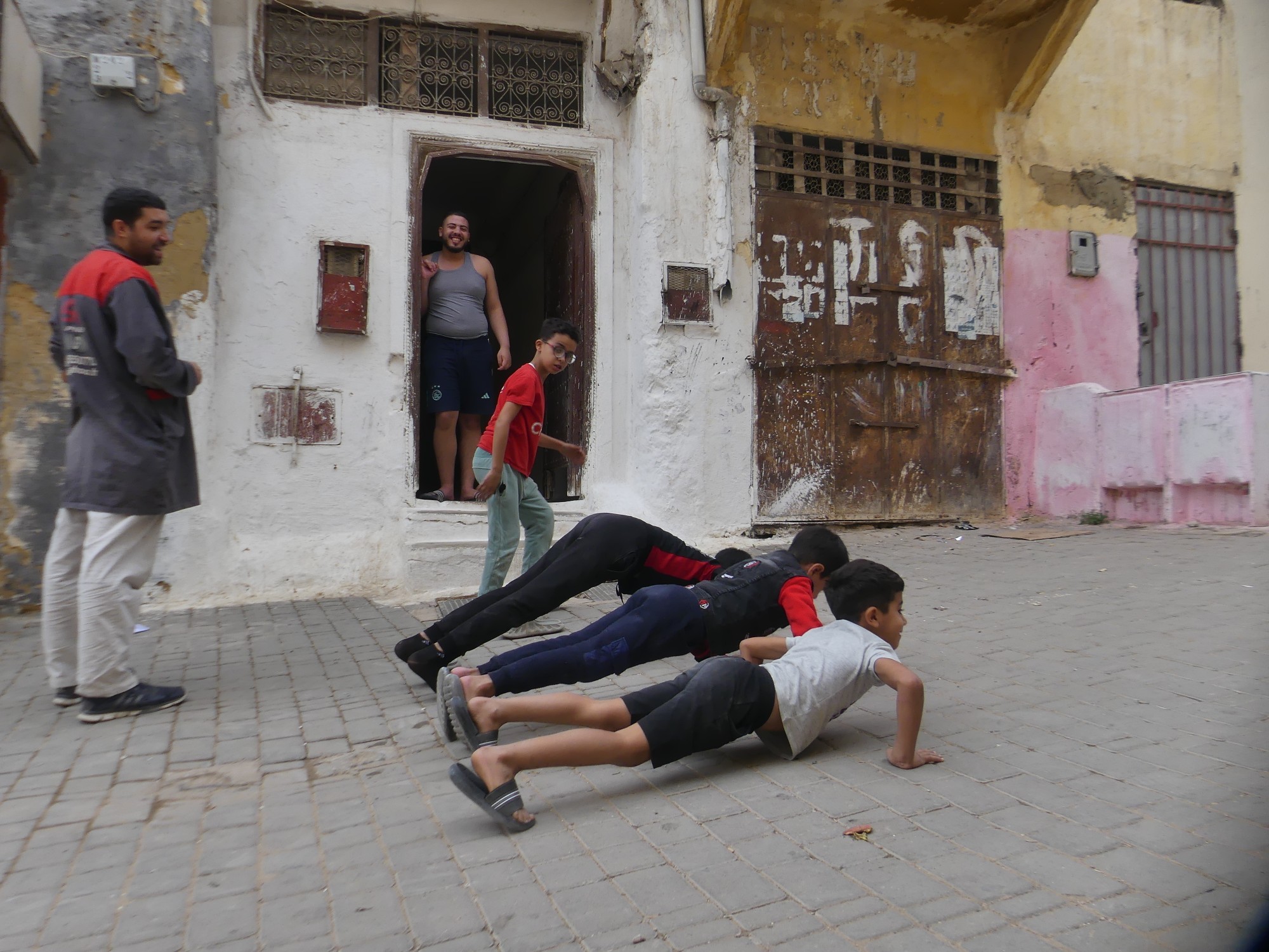 opérateurs touristiques. J’ai vu passer un cycliste au moins octogénaire, marocain, frisant le mètre cinquante et tremblotant, maillot cycliste et casque, les mains en position basse sur le cintre, à environ 6 km/h. Et puis ici les simplets, les handicapés de tous genres et les estropiés ne sont pas remisés dans des institutions, dans la journée ils sont dans la rue. Les regards ici ne sont pas pesants, ils ont l’habitude des touristes occidentales. J’ai eu une longue discussion à propos du statut des femmes, de l’état de la France, et de sa vie avec Hamid, le sympathique employé de cet hôtel, retraité de l’armée. Les femmes de ménage sont black, parlent berbère et chouilla français.