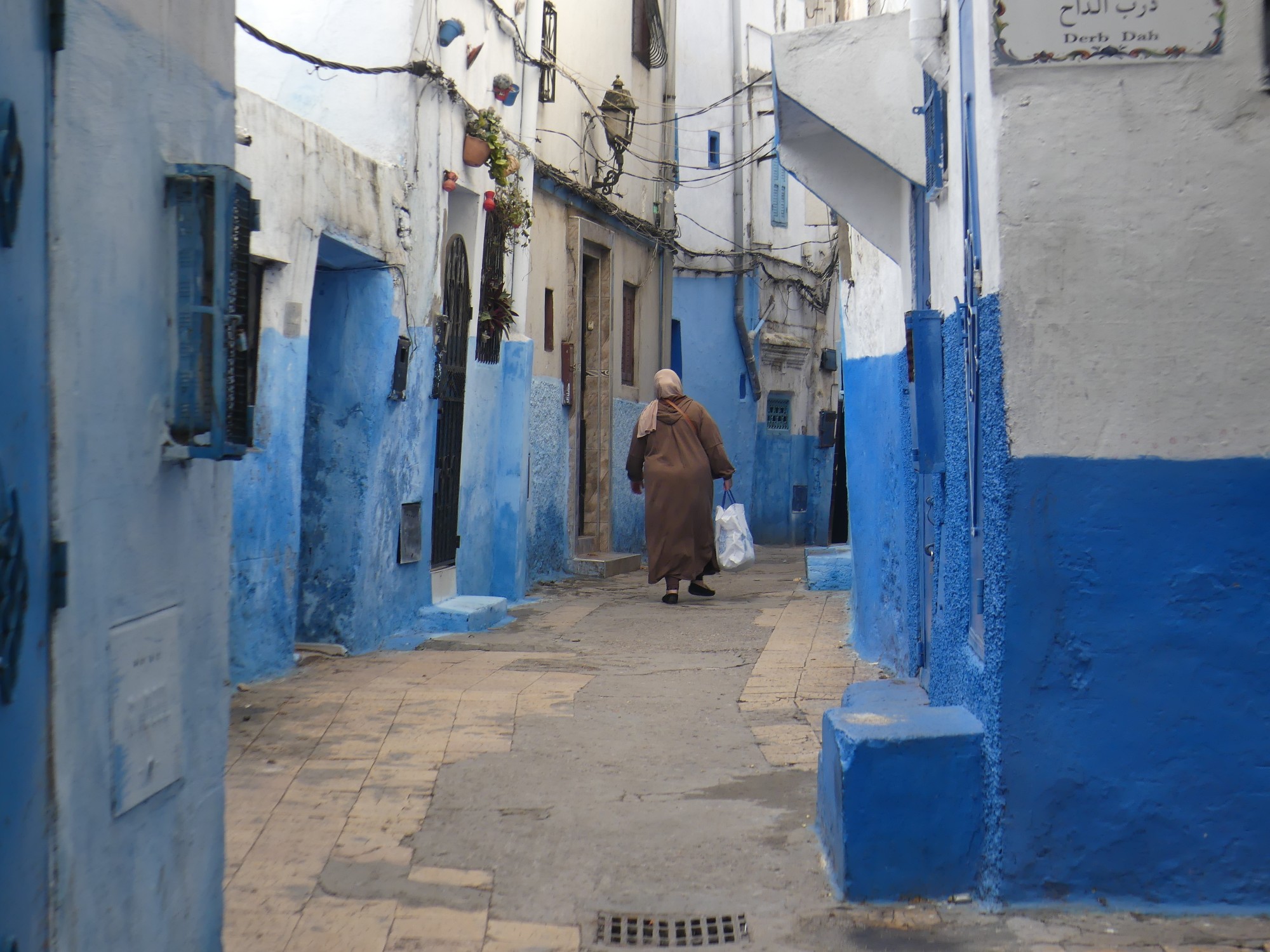 table de chevet, une lucarne sur le patio garni de plantes vertes, une autre sur la rue calme, des patères, un miroir, sol carrelé et belle faïence au mur. C'est gai et coloré, le tout dans la superficie d’une petite cabane du Risoux, 2 x 2,4 m ! Douche chaude et toit terrasse, que demande le peuple ? Je pose mes affaires, mange mon pique-nique et pars visiter la petite bourgade, très charmante. Le port de pêche est croquignolet, l’esplanade trop propre, la médina derrière les remparts offre du calme, des petites ruelles à foison, plein de fresques murales. Bref, c’est encore une très jolie halte que je fais là. Au coucher du soleil, celui-ci éclaire les remparts et les murs blancs et bleus. Rien à dire, c’est très sympa. Saison morte, à part deux bus de touristes et une quinzaine de campings-cars sur le parking qui leur est attribué, personne. D’ailleurs je suis absolument seule à l’auberge.