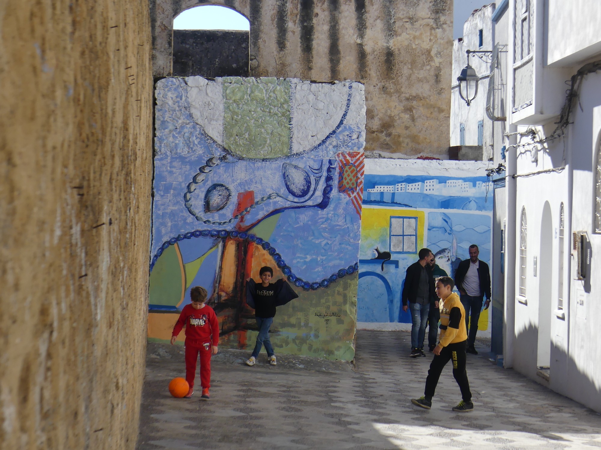 plafond diffuse de la lumière même “éteinte”, et ça, c’est plus embêtant, et je ne peux pas l’atteindre ! Une fois douchée et ma lessive faite et mise à sécher sur le toit-terrasse, je peux partir voir cette ville que j’avais imaginée sans intérêt. Eh bien, j’ai été très surprise. D’abord il y a la violence de l’océan qui prend aux tripes ici encore, les alignées de tétrapodes brise-lames à l’entrée du port et de la lagune, les anciens remparts et bastions, en rénovation, la plage immense en face, le port aux bateaux colorés, la médina pour le moins labyrinthique, toute en pente et en escaliers, et qui se prend parfois pour Chefchaouen avec ses bleus et son blanc, qui dégringole jusqu'à une grande esplanade où les gosses jouent au foot, et il y a la corniche, et le gros ovale central de la ville nouvelle où l’architecture est espagnole, et le marché sur une jolie place pavée ornée de fresques murales. Bref… c’eût été dommage de ne pas venir à Larache. Dans la soirée comme prévu la pluie revient, mais ma lessive est sèche et je suis à l’abri !